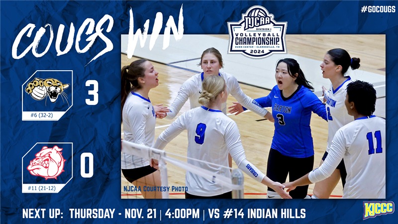 Chalking up their sixth straight sweep improving to 32-2 on the season, Barton advances to Thursday’s 4:00 p.m. quarterfinal round against 14th seeded Indian Hills Community College (26-9). Navarro’s second straight-set loss to the Cougars this season drops into the 10:00 a.m. consolation match with a 21-12 record.