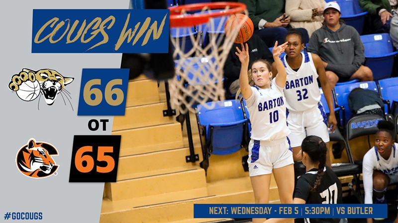 ARKANSAS CITY, Kan. (BartonSports.com) – Falling short of a comeback bid in the prior meeting back in November, the Barton Community College women’s basketball team pulled out a wild one on the road Saturday afternoon defeating Cowley College 66-65 in overtime at the William S. Scott Auditorium in Arkansas City, KS.