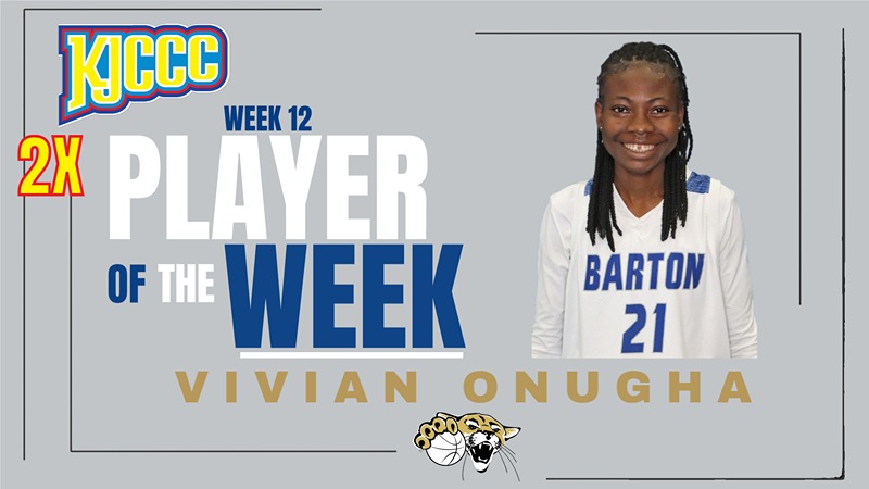 GREAT BEND, Kan. (BartonSports.com) – Barton Community College sophomore forward Vivian Onugha has been tabbed the week 11 Jayhawk Conference Division I women’s basketball Player of the Week announced on Tuesday after a stellar week that led to a pair of victories.