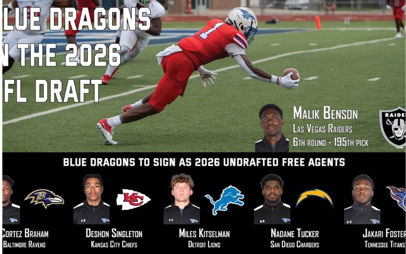 Two-time NJCAA All-American Malik Benson was the only Blue Dragon selected in the seven rounds of the draft. Four others – Cortez Braham, DeShon Singleton, Miles Kitselman and Nadame Tucker – were signed as undrafted free agents. Jakari Foster was invited to a free-agent mini-camp.