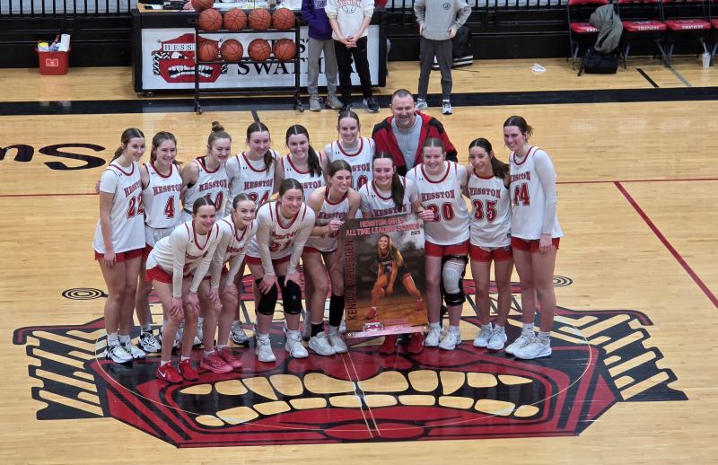 HESSTON, Kan. – In a rematch of games played on December 17 in Lindsborg, the Hesston Swathers picked up a home sweep of the Smoky Valley Vikings on Friday night. The highlight of the night saw Kendal Brueggen become the all-time leading scorer for Hesston as she led the top-ranked Swathers to a 17-point win. A big fourth quarter run for the Hesston boys gave them a resounding win in the nightcap.
