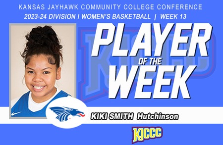HUTCHINSON, Kan. (KJCCC.org) – Hutchinson freshman guard Kiki Smith had a pair of clutch performances to help the No. 1-ranked Blue Dragon women to big wins at Cowley and over No. 21 Butler last week. Smith averaged 23.0 points per game, shooting 68.4 percent from the field and hitting 8 of her 10 attempted 3-pointers. She also averaged 2.5 rebound, 2.0 assists and 3.5 steals per game. Against Cowley, Smith scored 17 points with five steals to power the Dragons on the road. She then scored 15 of her game-high 29 points to lead a Blue Dragon comeback from 10 points down to defeat the No. 21 Grizzlies. The 10 free throws were a single-game season high.