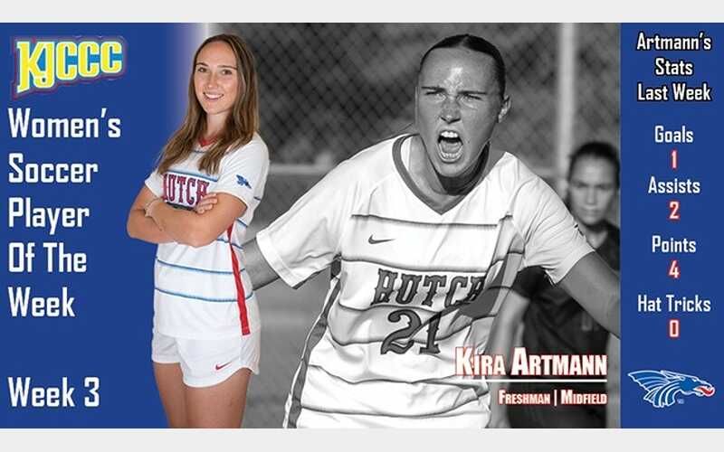 HUTCHINSON, Kan. (BlueDragonSports.com) – Hutchinson Community College freshman midfielder Kira Artmann was named the KJCCC Division I Women’s Soccer Player of the Week on Tuesday.