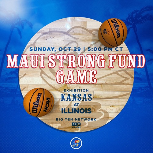 LAWRENCE, Kan. (KUAthletics.com) – No. 1 Kansas men’s basketball will face No. 25 Illinois in an exhibition contest on Sunday, Oct. 29, at 5 p.m. at State Farm Center in Champaign, Illinois. The meeting was originally scheduled as a secret scrimmage, but KU head coach Bill Self and Illini coach Brad Underwood made the game a fundraiser to provide financial resources for rapid response and recovery for the devastating wildfires in Maui.