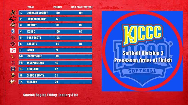 The Cavaliers earned nine of the 12 first-place votes and were picked to finish no lower than third to finish with a total of 140 points in the preseason poll to finish ahead of second-place Neosho County who earned 121 points despite not earning a single first-place vote. Last season, Johnson County went 19-3 in KJCCC play as part of a 46-12 overall record with the Cavaliers finishing as NJCAA Plains District Tournament runners-up and earning an at-large berth into the NJCAA Division 2 Softball World Series where JCCC went 2-2 with wins over Phoenix College and Central Alabama Community College. Neosho County put together a 39-16 overall mark last season which included an 18-4 record in conference play as the Panthers finished third at the Plains District Softball tournament with their two losses coming to District Tournament runner-up Johnson County and District Tournament Champion Fort Scott.