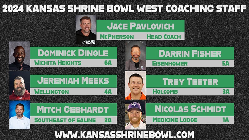 Assistant coaches for the West team are Dominick Dingle (6A – Wichita Heights), Darrin Fisher (5A – Eisenhower), Jeremiah Meeks (4A – Wellington), Trey Teeter (3A – Holcomb), Mitch Gebhardt (2A – Southeast of Saline), and Nicolas Schmidt (1A – Medicine Lodge). The West Coaching staff had a combined 56-20 record in 2023, with 1A Assistant Nicolas Schmidt making the deepest postseason run with a semifinal appearance at Medicine Lodge. Outside of Head Coach Jace Pavlovich, the West staff will all be coaching in the Kansas Shrine Bowl for the first time. Only Trey Teeter, Holcomb, has previous Kansas Shrine Bowl experience as a player on the 2016 West team.