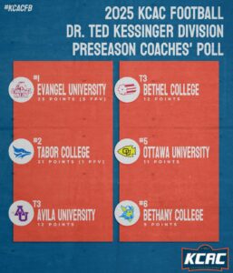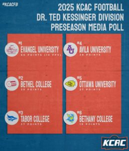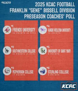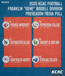 KANSAS —The Kansas Collegiate Athletic Conference released their preseason polls on Tuesday. Friends was picked to finish atop the Franklin “Gene” Bissell Division by both the media and coaches, while Evangel was chosen as the top team in the Dr. Ted Kessinger Division in both polls.