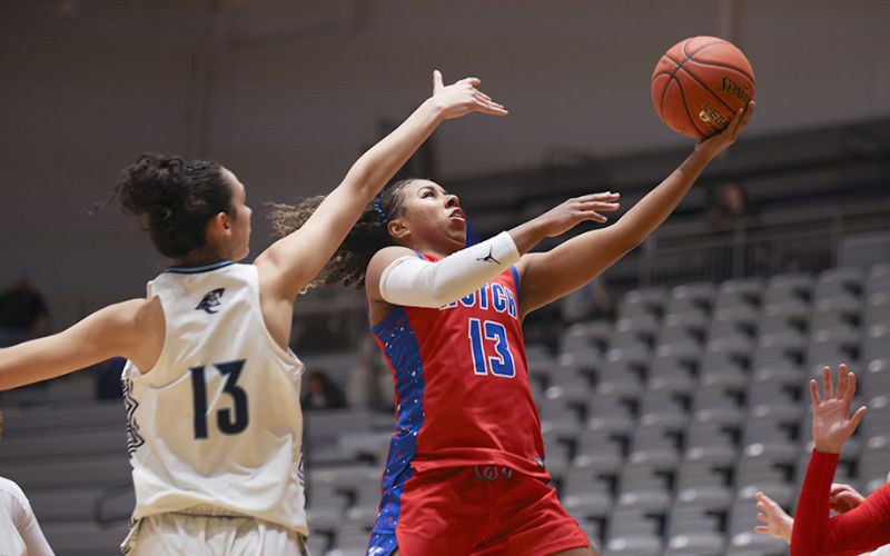 Freshman KaMyra Barber tied a career scoring high of 23 points to lead the Blue Dragons. She tied a career high, going 3 of 4 from 3-point range and was 10 of 16 overall. Barber added seven rebounds and four assists.