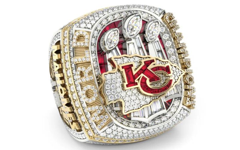 Front and center are the organization’s three Lombardi Trophies, each with a marquise diamond set atop. The trophies are set against a backdrop of 19 rubies and 38 diamonds, which reflects both the 38 points the Chiefs scored in the Super Bowl and the 57th edition of the game. In the middle of it all is the Chiefs’ logo, which itself is comprised of 16 rubies — the number of division titles for the franchise — and 50 diamonds to reflect the 50th anniversary of Arrowhead Stadium.