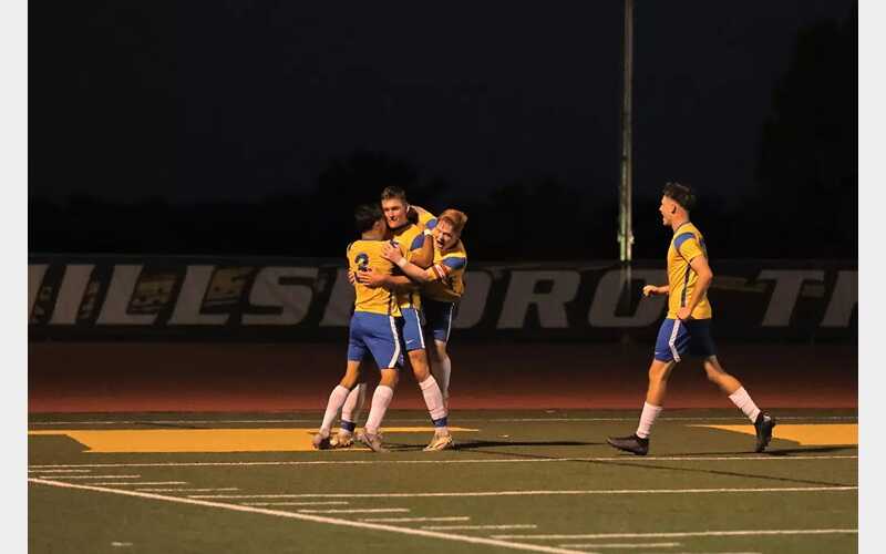It was a slow beginning to the cold and rainy match, with neither side creating many opportunities to put themselves ahead. Friends remained in possession for a majority of the first 20 minutes of the half, with three Falcons taking shots but none finding the back of the net. Andre Trigo retaliated with an attempt but sent it just wide, and it wasn’t until about 20 minutes later that any more action occurred. Ignacio Fabeiro recorded his second save of the half, still leaving both teams scoreless. Molelwa Abendelwa took his chance at scoring but deflected it off the post. With 2:20 remaining in the first half, Charlie Stammers delivered a corner kick that Cooper Taylor converted into a header for a much-needed Bluejay goal.
