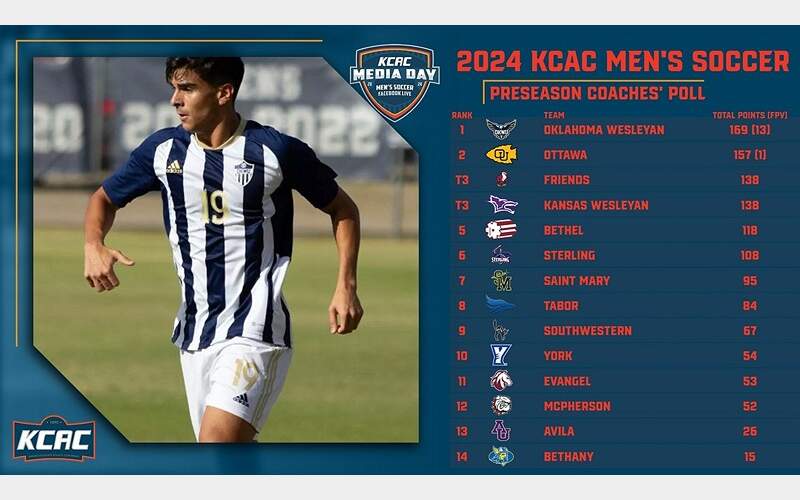 WICHITA, Kan. (KCACSports.com) — Oklahoma Wesleyan has earned the top spot in the 2024 Kansas Collegiate Athletic Conference (KCAC) Men’s Soccer Preseason Coaches’ Poll, the conference office announced Friday.