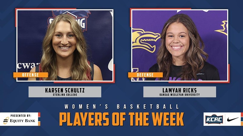 WICHITA, Kan. —Karsen Schultz of #21 Sterling College and LaMyah Ricks of Kansas Wesleyan University have earned the KCAC Women’s Basketball Offensive and Defensive Player of the Week honors, respectively, the conference office announced Monday. The two student-athletes were selected for their performances from Feb. 13-19 by a vote of conference sports information directors. All KCAC Player of the Week honors are presented by Equity Bank.