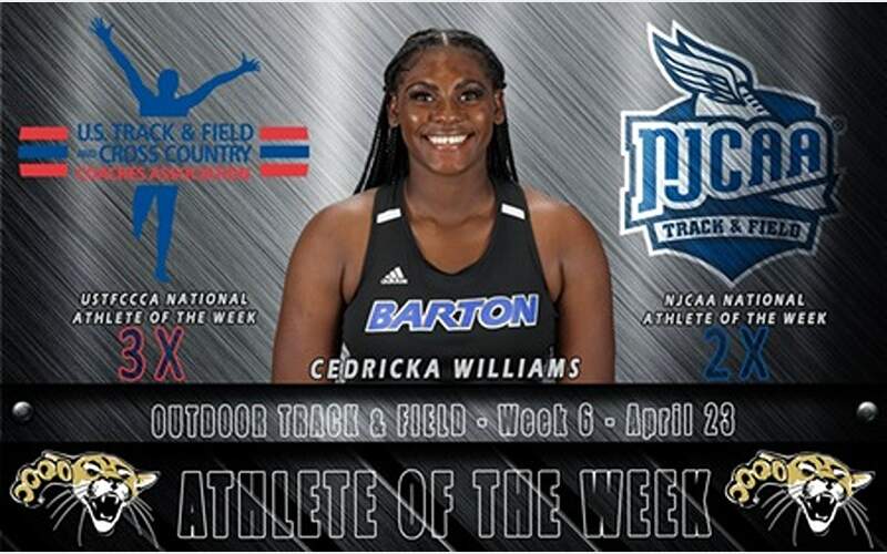 GREAT BEND, Kan. (BartonSports.com) – Continuing her rewriting of record books, Cedricka Williams of the 3rd ranked Barton Community College women’s track and field team has been named the U.S. Track & Field and Cross Country Coaches Association (USTFCCCA) and National Junior College Athletic Association (NJCAA) Outdoor Women’s Athlete of the Week.