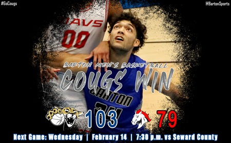 (BartonSports.com) – All twelve Cougars contributed to a Saturday evening high flying 103-79 victory for the 3rd ranked Barton Community College men’s basketball team visiting Northwest Kansas Technical College.