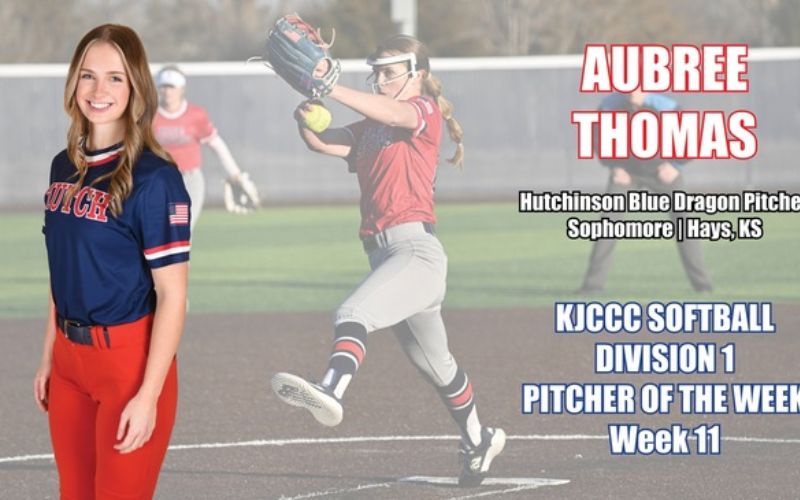 Hutchinson Community College sophomore pitcher Aubree Thomas was named the KJCCC Division I softball Pitcher of the Week for Week 11 on Tuesday.