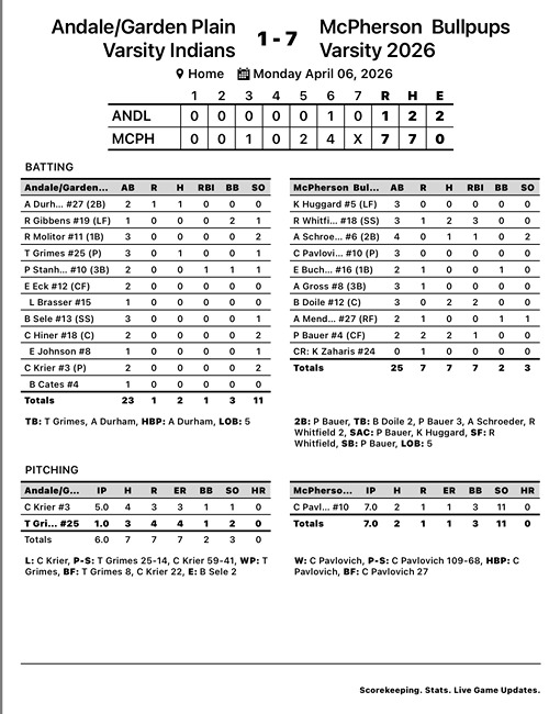 McPHERSON, Kan. – McPherson High School Softball swept the Andale/Garden Plain (Andale/GP) Indians on Monday, April 7, highlighted by a three-run walk-off home run by Rylie Whitfield in game two.