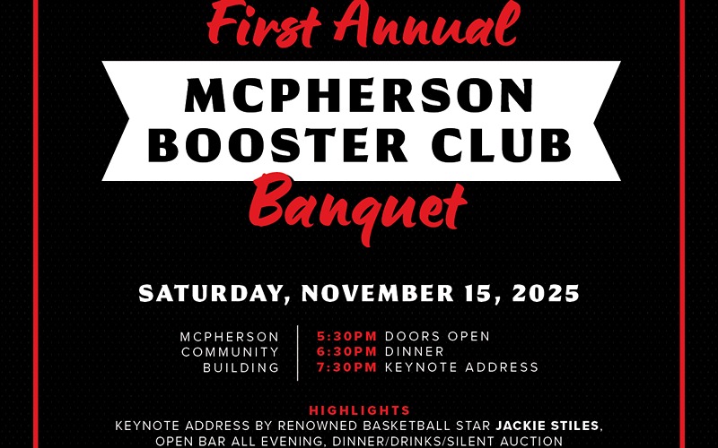 McPHERSON, Kan. - The McPherson Bullpup Booster Club announced that they will host their 1st Annual Banquet, which will take place Saturday, Nov. 15, at the McPherson Community Building.The evening will consist of a dinner, an open bar, a silent auction, and a keynote speaker.... Read More.