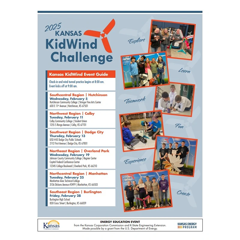 TOPEKA, Kan. — The 2025 Kansas KidWind Challenge kicks off this week. The annual competition has grown significantly from one regional challenge with 14 teams in 2016 to six regional events with a total of 94 teams from 48 schools this year.The first regional... Read More.