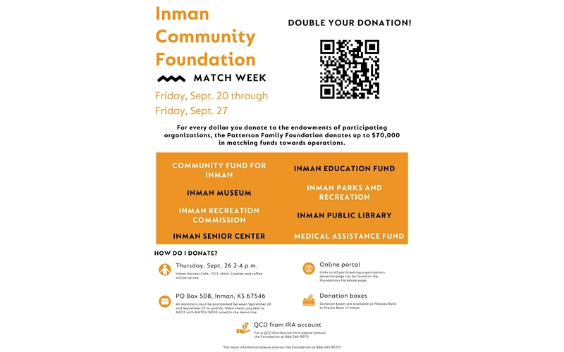 By the Inman Community Foundation INMAN, Kan. — The Inman Community Foundation is excited to announce that we have received a grant to increase the amount that we can match for our upcoming Match Week! This grant, gifted from the Patterson Family Foundation, will... Read More.