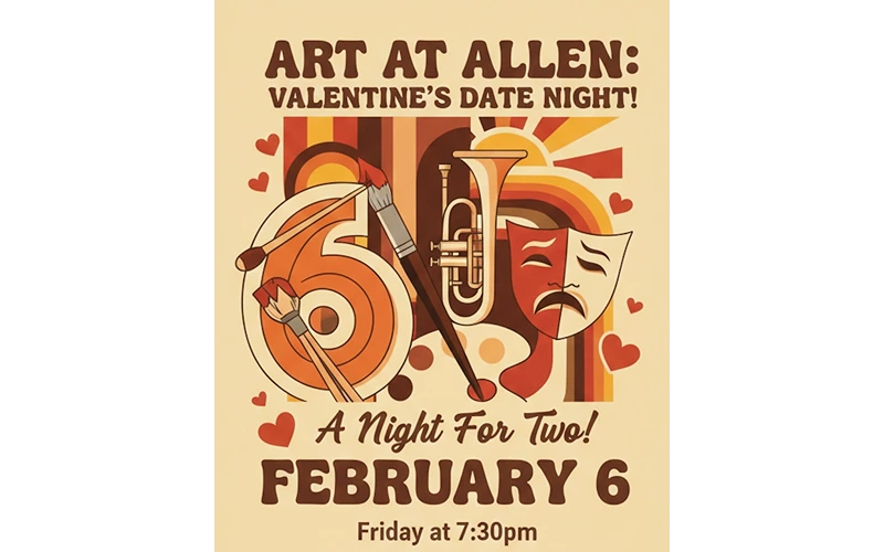 Fri, Feb 6 from 7:30pm to 7:30pmThe Allen Theatre & Film Department presents Art at Allen: Valentine’s Date Night, a night for two Featuring a great entertainment lineup. Reserve your tickets in advance.