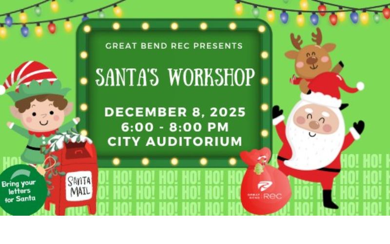 Great Bend Rec invites families to mark their calendars for the 29th Annual Santa’s Workshop, coming up on Monday, December 8th, from 6:00 – 8:00 p.m. in the Great Bend City Auditorium.