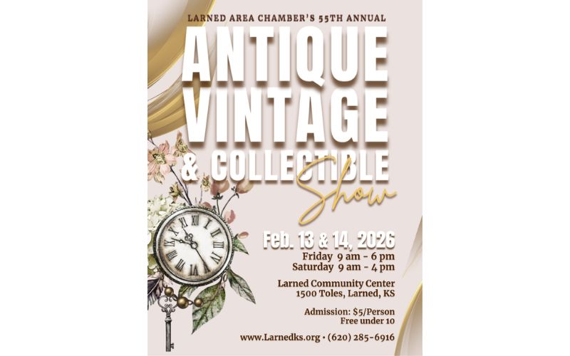 Fourteen antique and collectible dealers will be on hand at the Larned Community Center February 13th and 14th for the Chamber’s 55th Annual Antique, Vintage and Collectible Show.  Hours are Friday 9 am – 6 pm and Saturday 9 am – 4 pm.
