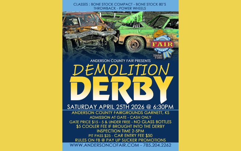 The Anderson County Fair is having their annual Spring Demolition Derby on Saturday, April 25, 2026, in Garnett, Kansas, at the fairgrounds rodeo arena. Start time is 6:30 p.m. THIS IS A CASH ONLY EVENT!!! Admission is at gate only & is $15 per person. Children 5 & under are free. NO glass bottles & there will be a $5 cooler fee if brought in. A pit pass is $25/person. Car entry fee is $50.