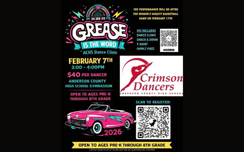 The ACHS Dance Team is hosting a dance clinic, Grease is the Word, on Saturday, February 7th, from 2 to 4 at the Anderson County High School Gymnasium. Open to ages Pre-K through 8th grade. The cost is $40 per dancer.