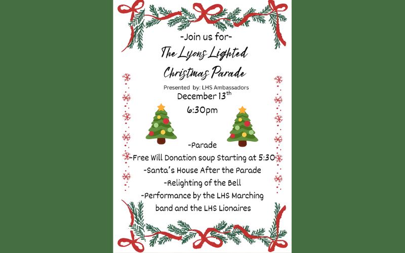 On Saturday, December 13th, head to Lyons for a magical evening of lights, music, and holiday cheer. The annual Lighted Christmas Parade will brighten the Lyons Square at 6:30 p.m. A freewill soup supper will start at 5:30 p.m. Following the parade, stop by Santa’s House, and enjoy festive performances from the Lyons High School Marching Band and Lionaires.