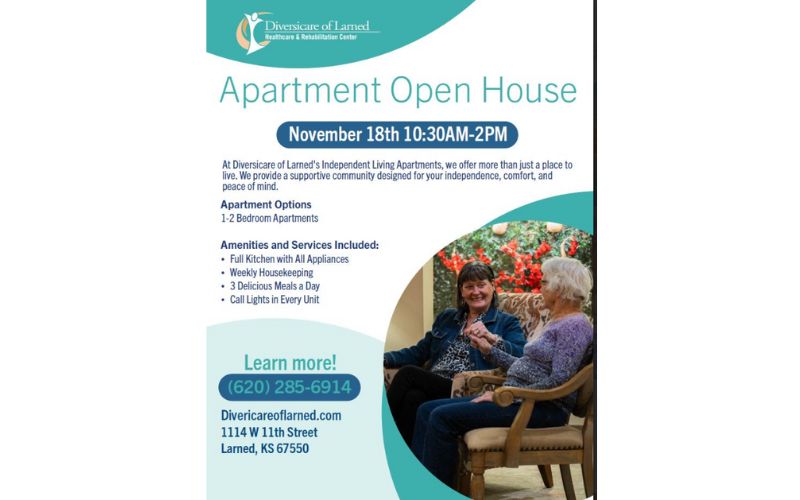 Diversicare of Larned invites you to their Apartment Open House Event on Tuesday, November 18th from 10:30 AM – 2 PM to learn more about their 1-2 bedroom Independent Living Apartments options.
