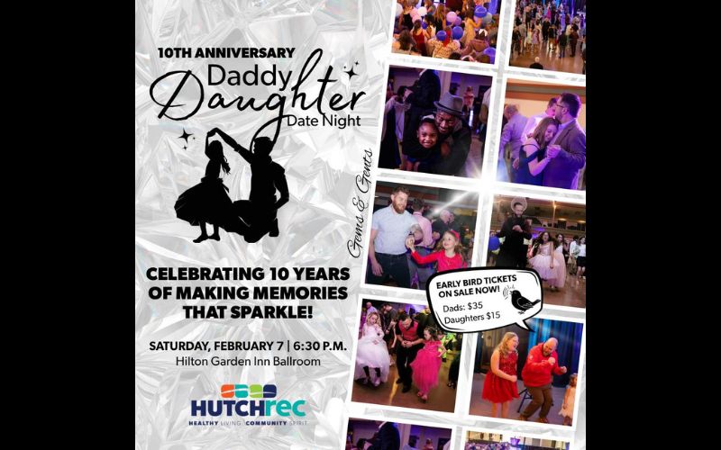 Celebrate the 10th Anniversary of Hutch Rec’s Daddy Daughter Date Night on Saturday, February 7th, from 6:30 to 8:30 p.m. at the Hilton Garden Inn in Hutchinson.