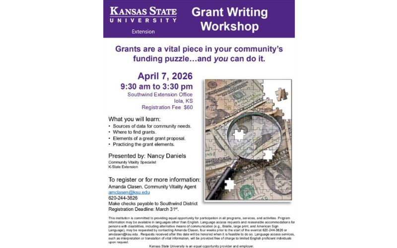 The Southwind Extension District will be hosting an in‑person Grant Writing Workshop on Tuesday, April 7th, from 9:30 AM to 3:30 PM at the Southwind Extension District Office in Iola, KS.