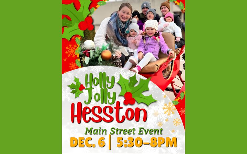 Saturday, December 6th, it’s Holly Jolly Hesston, from 5:30 to 8:00 p.m. on Main Street in Hesston. This festival family adventure features Story Time with Santa, hot cocoa, cookie decoration, train rides, a street dance, and the mayor’s Christmas Tree Lighting.