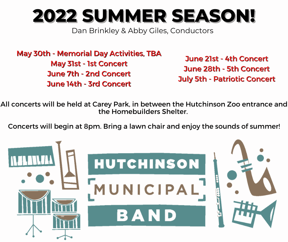 The Hutchinson Municipal Band has announced there its 2025 Summer Concert Series beginning on Tuesday, June 3, at 8:00 pm. Regular Tuesday performances are June 3, June 10, June 17, June 24 and July 1. Salt City Jazz Band takes the stage July 8 and July 15. All Tuesday performances will be held at the Recital Hall at the String Fine Arts Center.