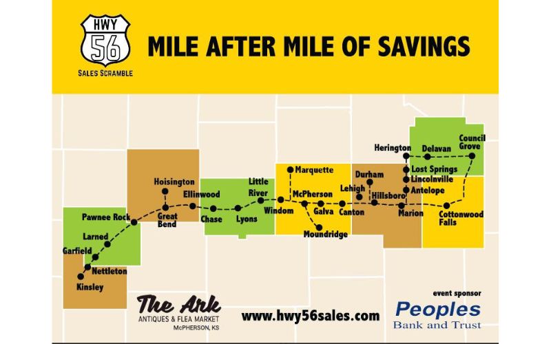 Do you want to be a part of the upcoming 200 mile garage sale? Then register for the upcoming 2026 US Hwy 56 Garage Sale which will be held April 23rd through April 26th. You can register for one day, two days or all four days, it’s your choice. The sale runs from Council Grove, Kansas to Kinsley, KS. Larned and Garfield are along this route and it’s the perfect opportunity for you to go through your garage or attic and dig out stuff you want to sell! The Ark and their team in McPherson created this event in 2025 and only did 100 miles. They have now expanded it to 200 miles.