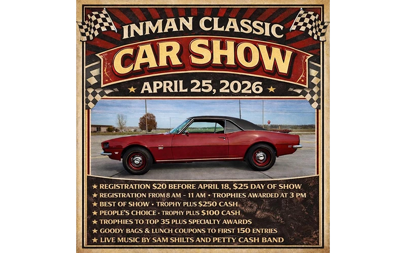 Head to Inman on Saturday, April 25th for the 36th Annual Inman Classic Car Show! View 150+ cars on Main Street and enjoy live music, food from local restaurants and vendors! There will be a cake walk and Kiddy Dash for Cash and Candy at 11:30.