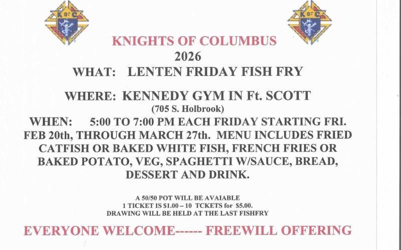 Come join us for the Knights of Columbus Lenten Fish Fry at Kennedy Gym in Ft. Scott (705 S. Holbrook)!
