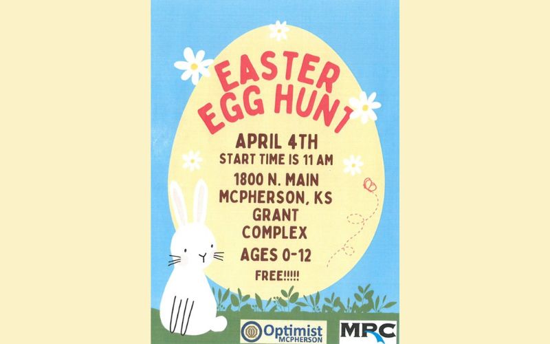 Join the McPherson Optimist Club for a FREE Easter Egg Hunt on Saturday, April 4th at the Grant Complex. Start time is 11 a.m. Ages 0-12