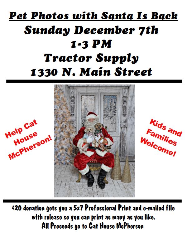 Fund raiser for Cat House McPherson (formerly the Humane Society). Santa will be available for photos with pets and kids or families are welcome to be in the picture as well. Photos will be taken by a professional photographer (Pam Pjesky) and for a $20 donation you will receive a professional 5×7 print and the digital file by e-mail so you can use it to print additional pictures or use it in your own Christmas card design. All proceeds go to Cat House McPherson to support their efforts.