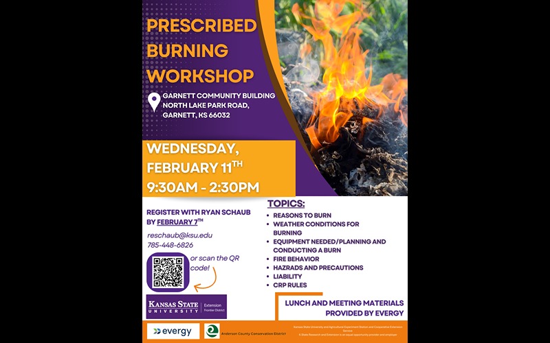 K-State Research and Extension Frontier District, in partnership with the Anderson County Conservation District, will host a prescribed burn school for landowners and producers. The event is scheduled for Wednesday, February 11, from 9:30 a.m. to 2:30 p.m. at the Anderson County Community Building, located on North Lake Road next to the fairgrounds in Garnett. Meeting materials and lunch will be provided by Evergy.
