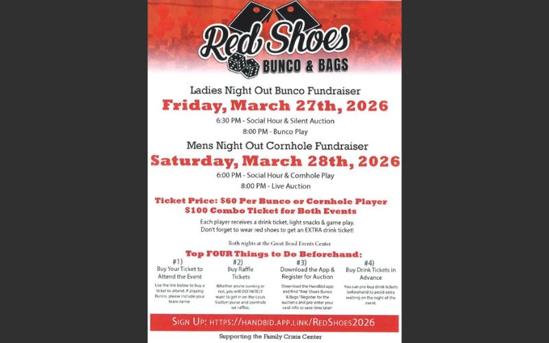 The Red Shoes Bunco and Bags event benefits the Family Crisis Center, Inc. located in Great Bend, Kansas. The Family Crisis Center serves victims of domestic and sexual violence and child abuse and neglect in twelve counties across central Kansas. For more information, visit their website at www.familycrisiskansas.com.