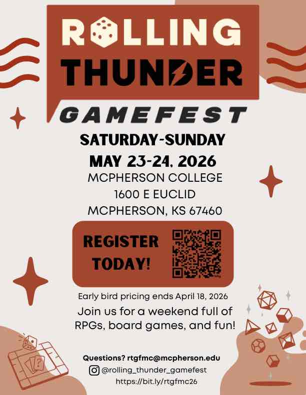 The inaugural Rolling Thunder Gamefest—a weekend of role-playing games, board games, geeky vendors, and more! Hosted at McPherson College and open to the public (family-friendly)!