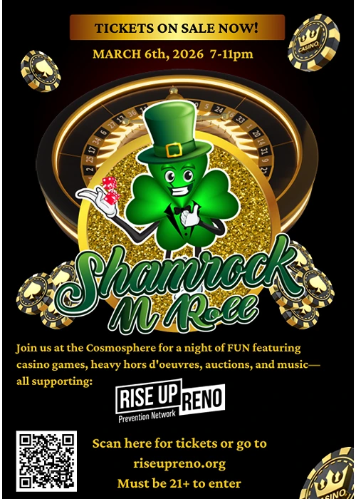 Get your tickets for Shamrock n Roll, a fun night of FUN featuring casino games, heavy hors d’oeuvres, auctions, and music — all supporting the Rise Up Reno Prevention Network!