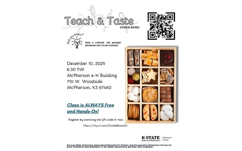 friends or come and make new friends while we make this month’s recipe – Cookie Boxes! Please register for the class on the McPherson County Extension Office Facebook page or by calling their office at 620-241-1523. Class is free!