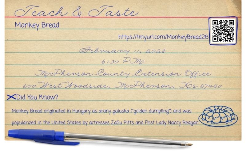 Teach & Taste Class – 6:30 p.m.-7:30 p.m. at the McPherson County Extension Office – 600 W. Woodside. Bring your