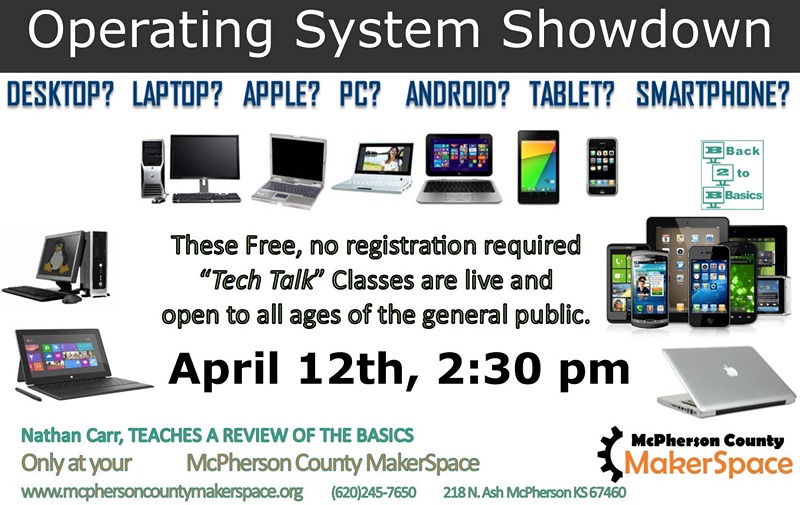 Nathan Carr, Teaches a review of the basics at the McPherson County MakerSpace on April 12th, 2:30 p.m.