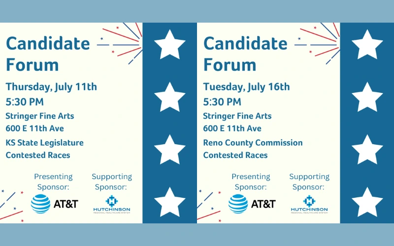 HUTCHINSON, Kan. — The 2024 KS State Candidate Forum will be held at Stringer Fine Arts, 600 E. 11th Avenue, on Thursday, July 11th at 5:30 p.m. The following candidates are invited to participate: KS Senate District 34 – Bob Fee, Michael Murphy. KS Representative District 102 – Tyson Thrall, Kyler Sweely. KS Representative District 114 – Steve Schweizer, Kevin Schwertfeger. Questions may be submitted in advance HERE.