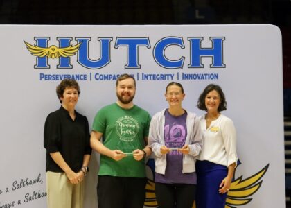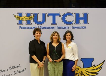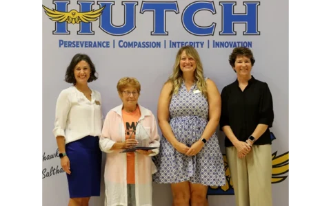 Last year, convocation planners revived an old tradition- recognizing Salthawk staff for their milestone anniversaries. More than half of the USD 308 staff has worked in the district for five years or longer. Staff were asked to stand and be recognized for their work anniversaries in five-year increments. As the Salthawk Service Awards closed, one staff member remained standing. Patricia Lillard, First Grade Teacher at Lincoln-McCandless Elementary, received a standing ovation as she was recognized for 45 years of service to Hutchinson Public Schools. She accepted a certificate and an engraved award from Dr. Johnson on stage. Not only have many Salthawk staff members worked alongside Mrs. Lillard, she has had many Salthawk staff as students in her own classroom. Her legacy extends far beyond her classroom and has touched many lives in the USD 308 and Hutchinson communities.