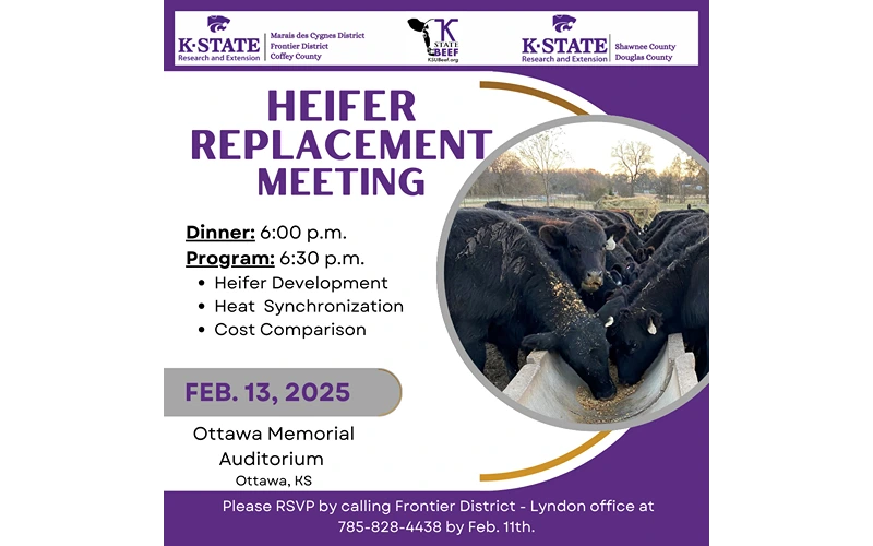 To explore topics surrounding these questions, K-State Research and Extension offices in the region will host a heifer replacement/retention meeting on February 13, 2025, at Ottawa Memorial Auditorium, 301 S. Hickoryin Ottawa beginning with a meal at 6 p.m.; the program will start at 6:30 p.m. RSVP for the event by Feb. 11th to Frontier Extension District agriculture agent Rod Schaub by calling 785-828-4438 or by emailing [email protected]. Free will donations will be kindly accepted to offset the cost of the meal.