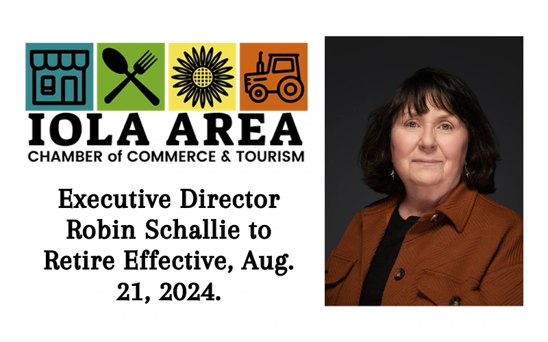 IOLA, Kan. — Iola Area Chamber of Commerce and Tourism Executive Director Robin Schallie announced today that she will be retiring from her position effective Aug. 21, 2024. Taking over as Executive Director will be Kelly Sigg.